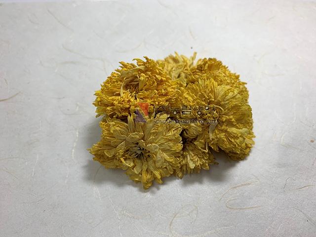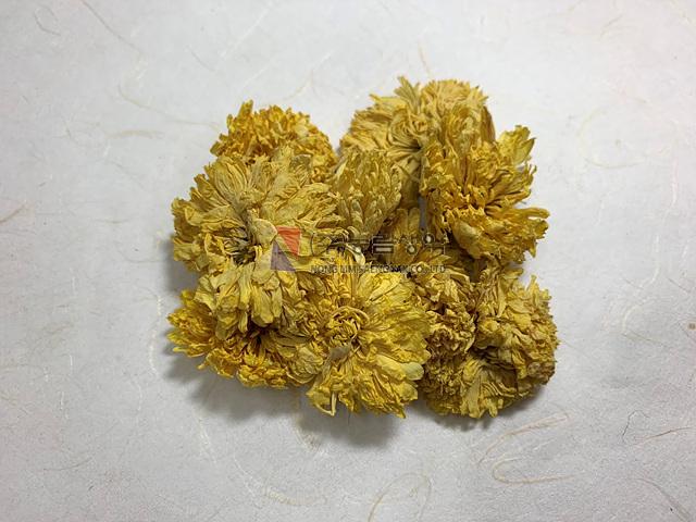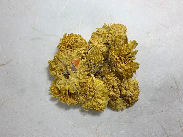 이 약은 꽃으로 납작하거나 고르지 않은 구형, 뒤집힌 원뿔모양 또는 원통형이고 약간 납작하게 눌려서 부채 모양을 이룰 때도 있으며 지름 1 4 cm이다. 총포는 나비 모양이고 포편은 3 4 층이며 달걀모양 또는 타원형이며 가죽질이다. 꽃받침은 반구형이고 꽃받침 조각이나 꽃받침 털은 없다. 설상화는 흰색 또는 노란색이고 여러 층이며 암그루이고 바깥을 둘러싸고 있다. 관상화는 적고 양성이며 가운데에 위치하고 설상화에 가려있으며 끝은 5 개로 갈려있다. 수과는 발육되지 않았고 관모가 없다. 이 약은 특유한 냄새가 있고 맛은 달고 약간 쓰다